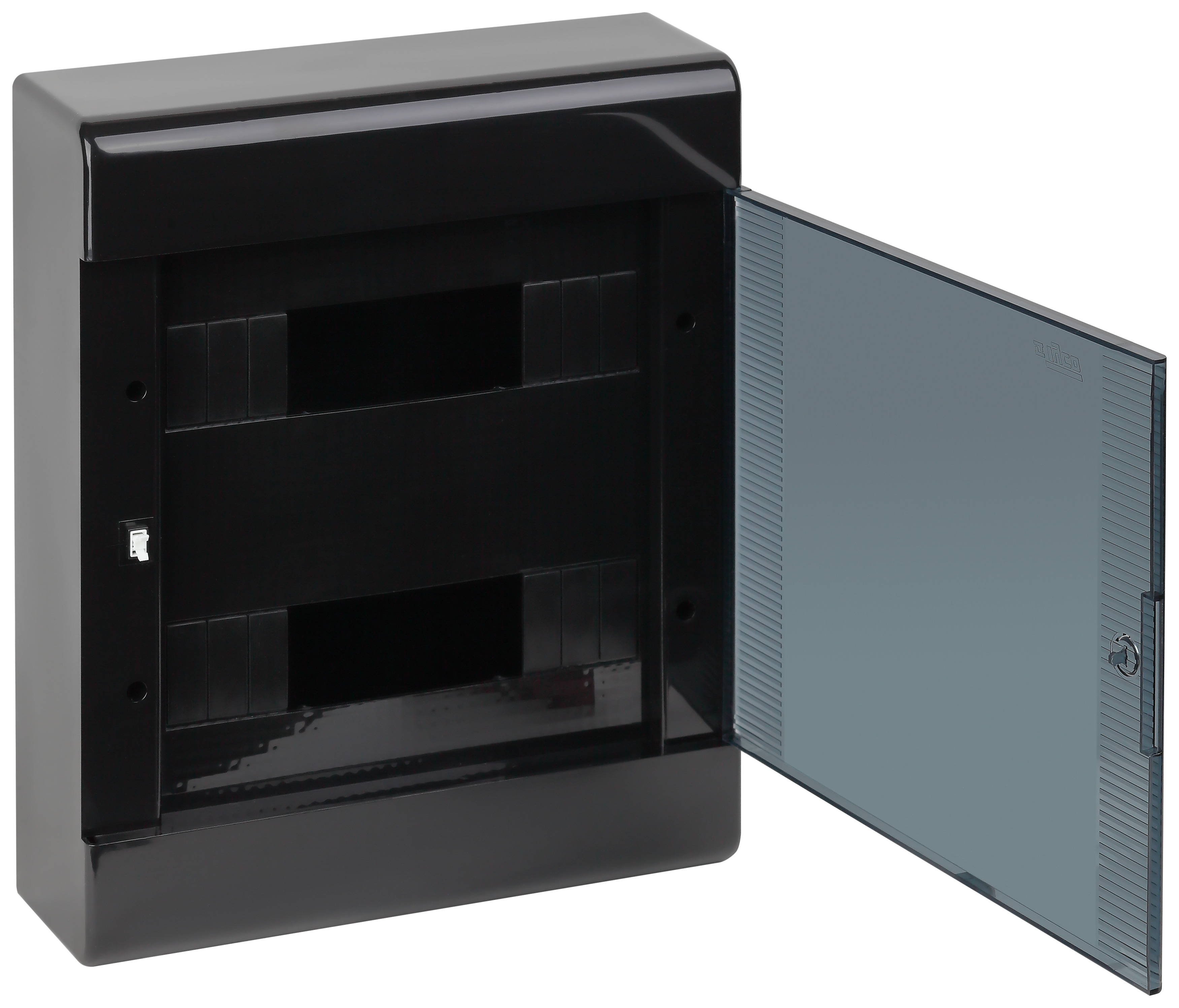 Щиток "Тусо" навесной с горизонтальной дверцей на 24 модуля, цвет черный, IP40. Минимальная партия отгрузки 1 шт. Назначение: предназначены для установки автоматических выключателей, устройств защитного отключения и любого прибора учета в жилых, административных и торговых помещениях. Отличительные особенности: высокое качество пластика, механическая прочность, богатая комплектация, перенавешиваемые дверцы, на внутренней части корпуса риски для ввода кабель-каналов любого размера, торцевые стороны щитка снабжены сменными панелями с рисками для подведения гофрированных и гладких труб диаметром 25, 32, 40 мм, регулируемые по глубине стойки крепления DIN-реек дают возможность монтажа модульного оборудования на разную глубину; щитки упакованы в индивидуальную упаковку.