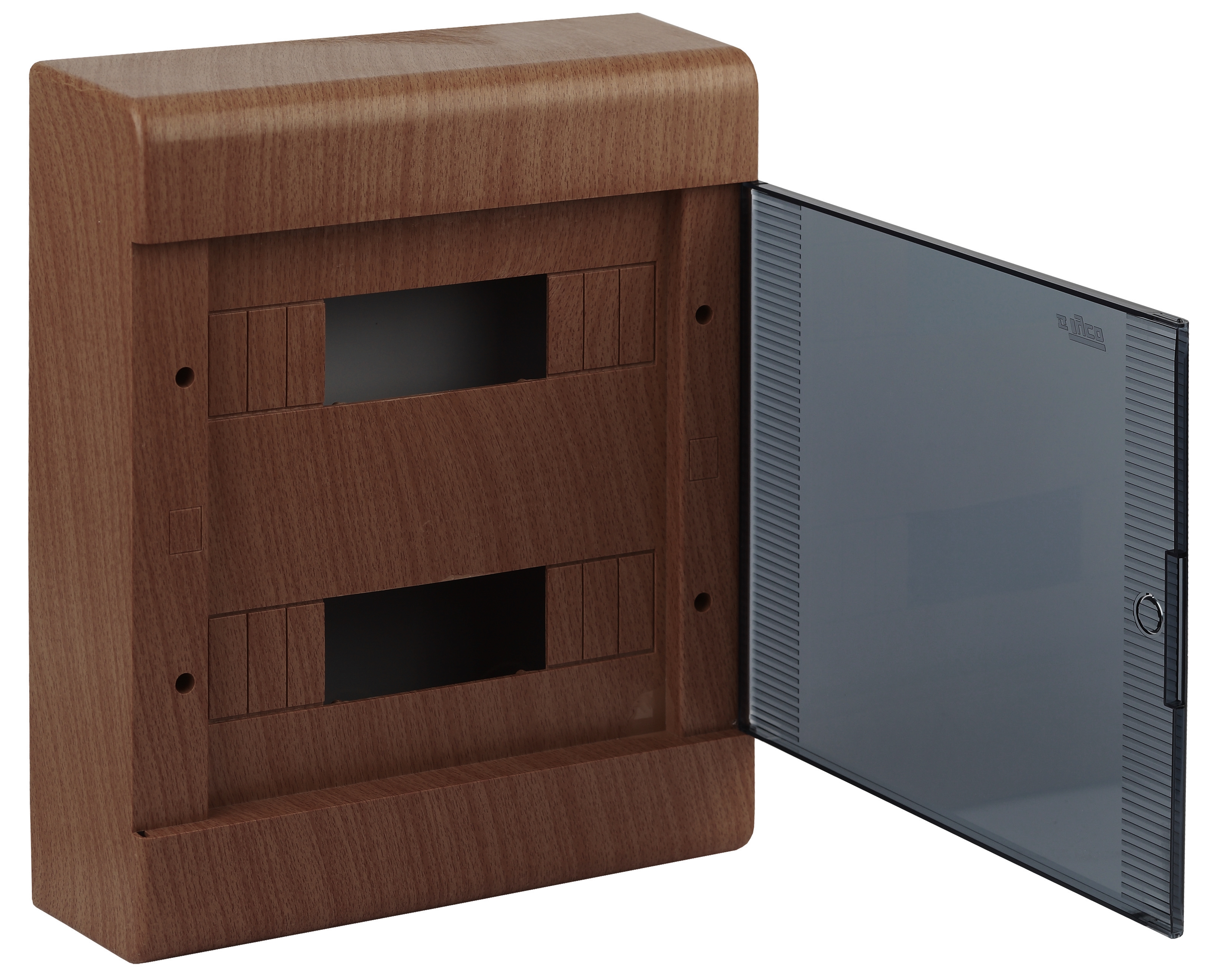 Щиток "Тусо" навесной с горизонтальной дверцей на 24 модуля цвет дуб, IP40. Минимальная партия отгрузки 1 шт. Назначение: предназначены для установки автоматических выключателей, устройств защитного отключения и любого прибора учета в жилых, административных и торговых помещениях. Отличительные особенности: высокое качество пластика, механическая прочность, богатая комплектация, перенавешиваемые дверцы, на внутренней части корпуса риски для ввода кабель-каналов любого размера, торцевые стороны щитка снабжены сменными панелями с рисками для подведения гофрированных и гладких труб диаметром 25, 32, 40 мм, регулируемые по глубине стойки крепления DIN-реек дают возможность монтажа модульного оборудования на разную глубину; щитки упакованы в индивидуальную упаковку.
