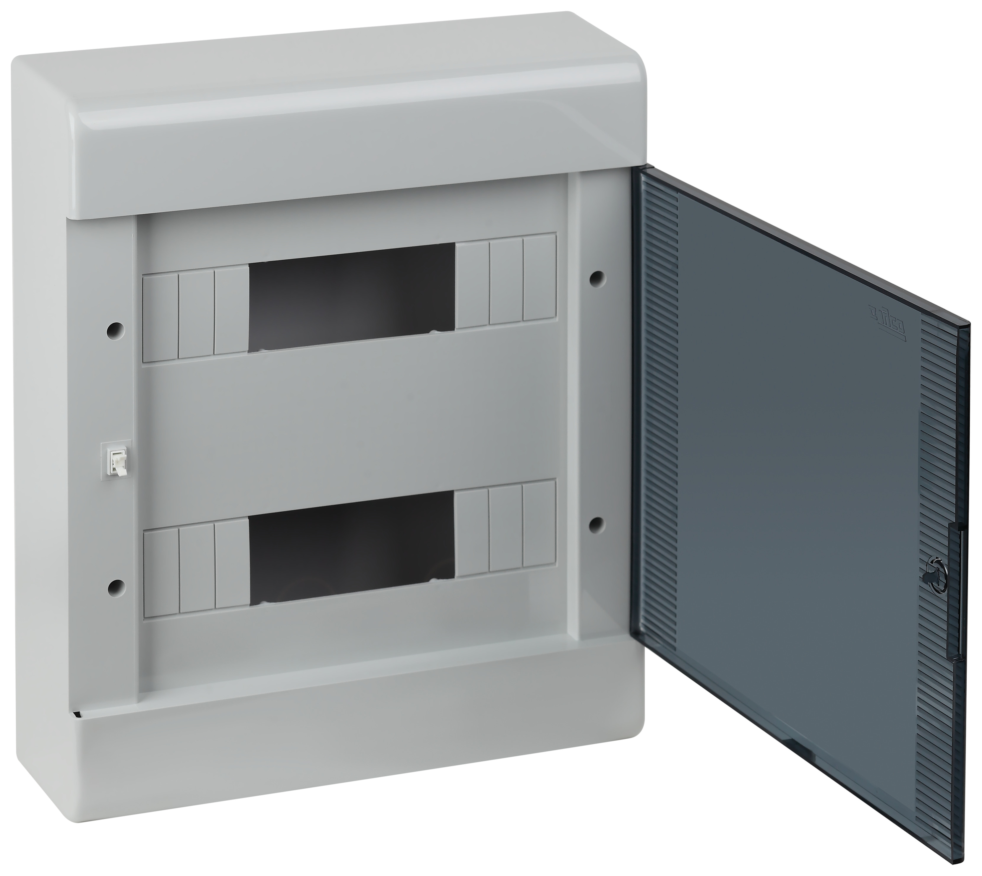 Щиток "Тусо" навесной с горизонтальной дверцей на 24 модуля цвет серый, IP40. Минимальная партия отгрузки 1 шт. Назначение: предназначены для установки автоматических выключателей, устройств защитного отключения и любого прибора учета в жилых, административных и торговых помещениях. Отличительные особенности: высокое качество пластика, механическая прочность, богатая комплектация, перенавешиваемые дверцы, на внутренней части корпуса риски для ввода кабель-каналов любого размера, торцевые стороны щитка снабжены сменными панелями с рисками для подведения гофрированных и гладких труб диаметром 25, 32, 40 мм, регулируемые по глубине стойки крепления DIN-реек дают возможность монтажа модульного оборудования на разную глубину; щитки упакованы в индивидуальную упаковку.