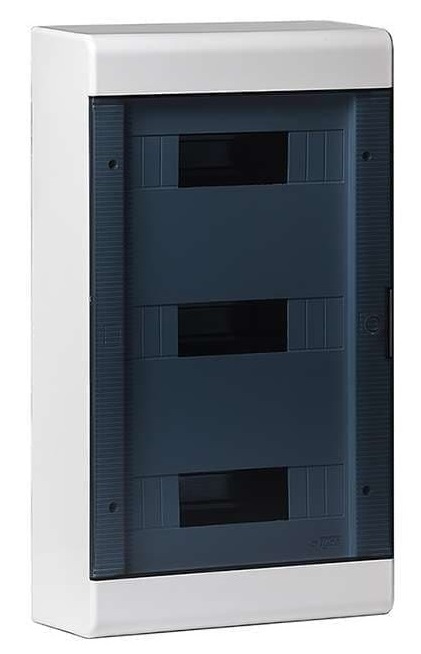 Щиток "Тусо" навесной с горизонтальной дверцей на 36 модулей цвет белый, IP40. Минимальная партия отгрузки 1 шт. Назначение: предназначены для установки автоматических выключателей, устройств защитного отключения и любого прибора учета в жилых, административных и торговых помещениях. Отличительные особенности: высокое качество пластика; механическая прочность; богатая комплектация; перенавешиваемые дверцы; на внутренней части корпуса риски для ввода кабель-каналов любого размера; торцевые стороны щитка снабжены сменными панелями с рисками для подведения гофрированных и гладких труб диаметром 25, 32, 40 мм; регулируемые по глубине стойки крепления DIN-реек дают возможность монтажа модульного оборудования на разную глубину; щитки упакованы в индивидуальную упаковку.