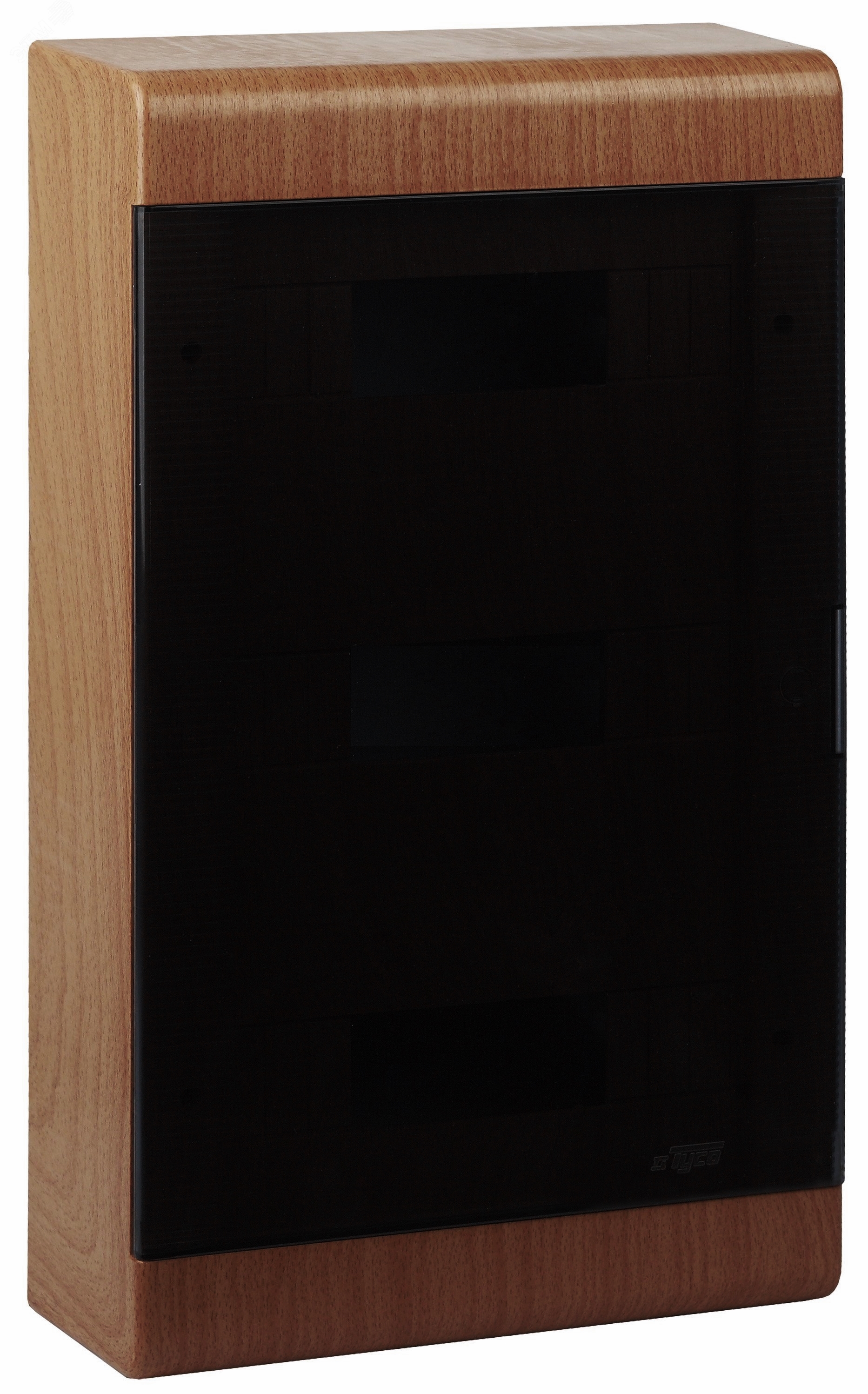 Щиток "Тусо" навесной с горизонтальной дверцей на 36 модулей цвет дуб, IP40. Минимальная партия отгрузки 1 шт. Назначение: предназначены для установки автоматических выключателей, устройств защитного отключения и любого нестандартного счетчика или прибора учета в жилых, административных и торговых помещениях. Отличительные особенности: высокое качество пластика; механическая прочность; богатая комплектация; перенавешиваемые дверцы; на внутренней части корпуса риски для ввода кабель-каналов любого размера; торцевые стороны щитка снабжены сменными панелями с рисками для подведения гофрированных и гладких труб диаметром 25, 32, 40 мм; регулируемые по глубине стойки крепления DIN-реек дают возможность монтажа модульного оборудования на разную глубину; щитки упакованы в индивидуальную упаковку.