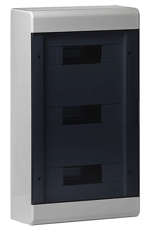 Щиток "Тусо" навесной с горизонтальной дверцей на 36 модулей, цвет серый, IP40. Минимальная партия отгрузки 1 шт. Назначение: предназначены для установки автоматических выключателей, устройств защитного отключения и любого нестандартного счетчика или прибора учета в жилых, административных и торговых помещениях. Отличительные особенности: высокое качество пластика; механическая прочность; богатая комплектация; перенавешиваемые дверцы; на внутренней части корпуса риски для ввода кабель-каналов любого размера; торцевые стороны щитка снабжены сменными панелями с рисками для подведения гофрированных и гладких труб диаметром 25, 32, 40 мм; регулируемые по глубине стойки крепления DIN-реек дают возможность монтажа модульного оборудования на разную глубину; щитки упакованы в индивидуальную упаковку.
