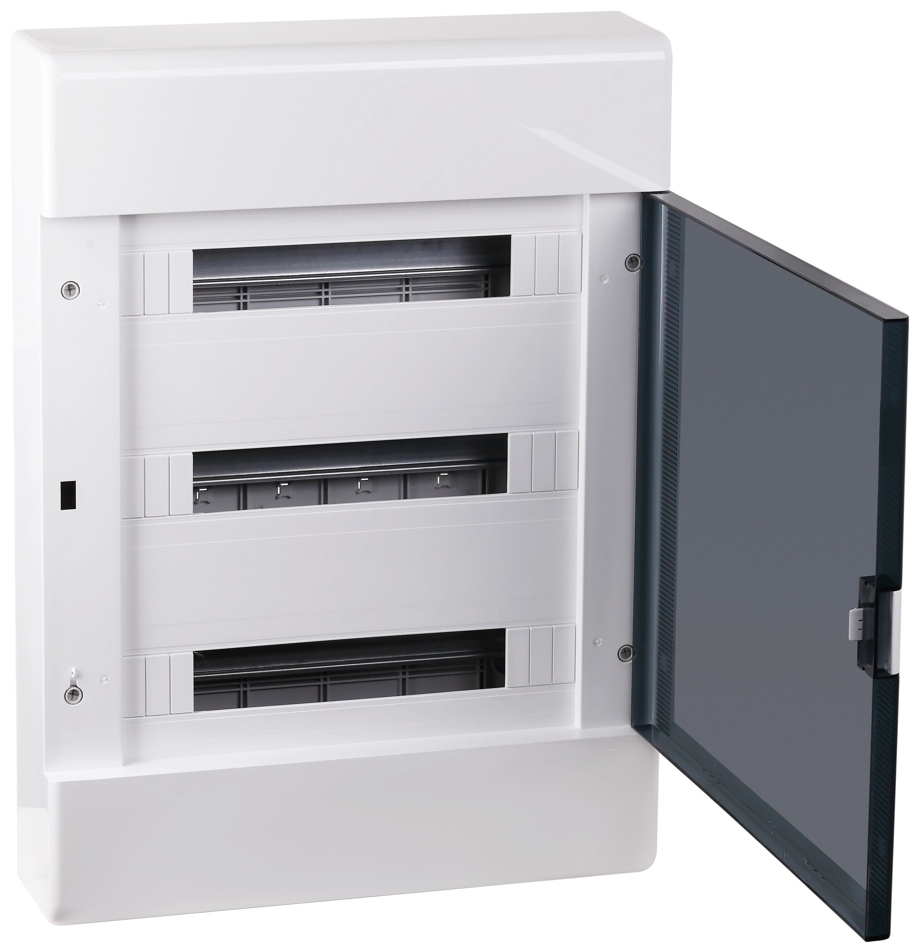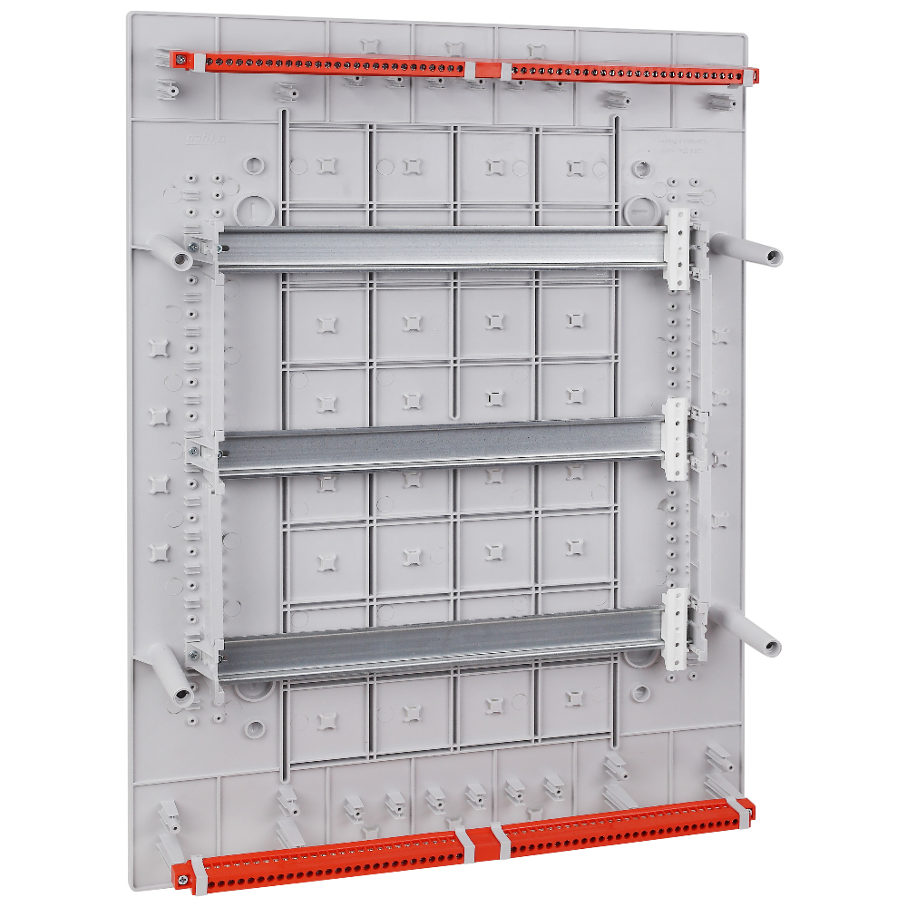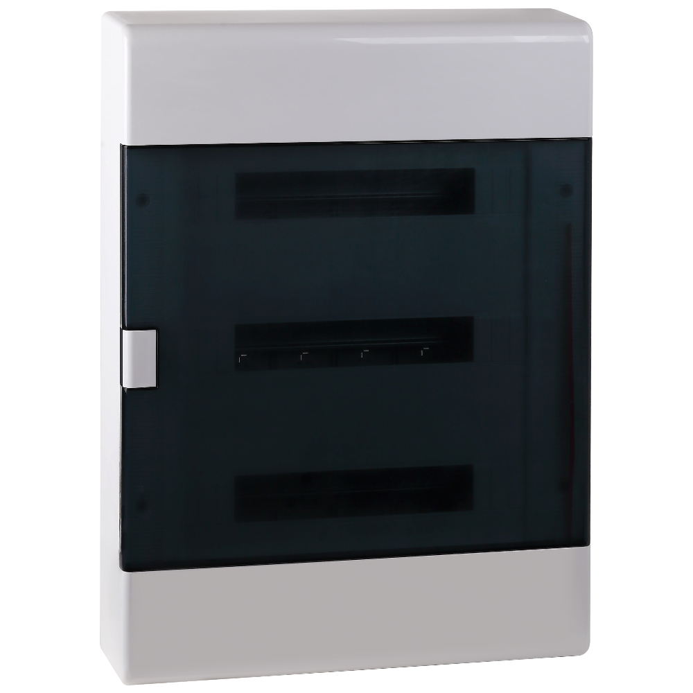Щиток "Тусо" навесной с горизонтальной дверцей на 54 модуля цвет белый, IP41. Минимальная партия отгрузки 1 шт. Назначение: предназначены для установки автоматических выключателей, устройств защитного отключения и любого нестандартного счетчика или прибора учета в жилых, административных и торговых помещениях. Отличительные особенности: высокое качество пластика; механическая прочность; максимальная комплектация; предусмотрена возможность монтажа пневматическим пистолетом; на основании щитка имеются отверстия для стяжки проводов хомутами; для удобства монтажа рамка с DIN-рейками съемная; перенавешиваемые дверцы; на внутренней части корпуса риски для ввода кабель-каналов любого размера; торцевые стороны щитка снабжены сменными панелями с рисками для подведения гофрированных и гладких труб диаметром 25, 32, 40 мм; регулируемые по глубине стойки крепления DIN-реек дают возможность монтажа модульного оборудования на разную глубину; щитки упакованы в индивидуальную упаковку.