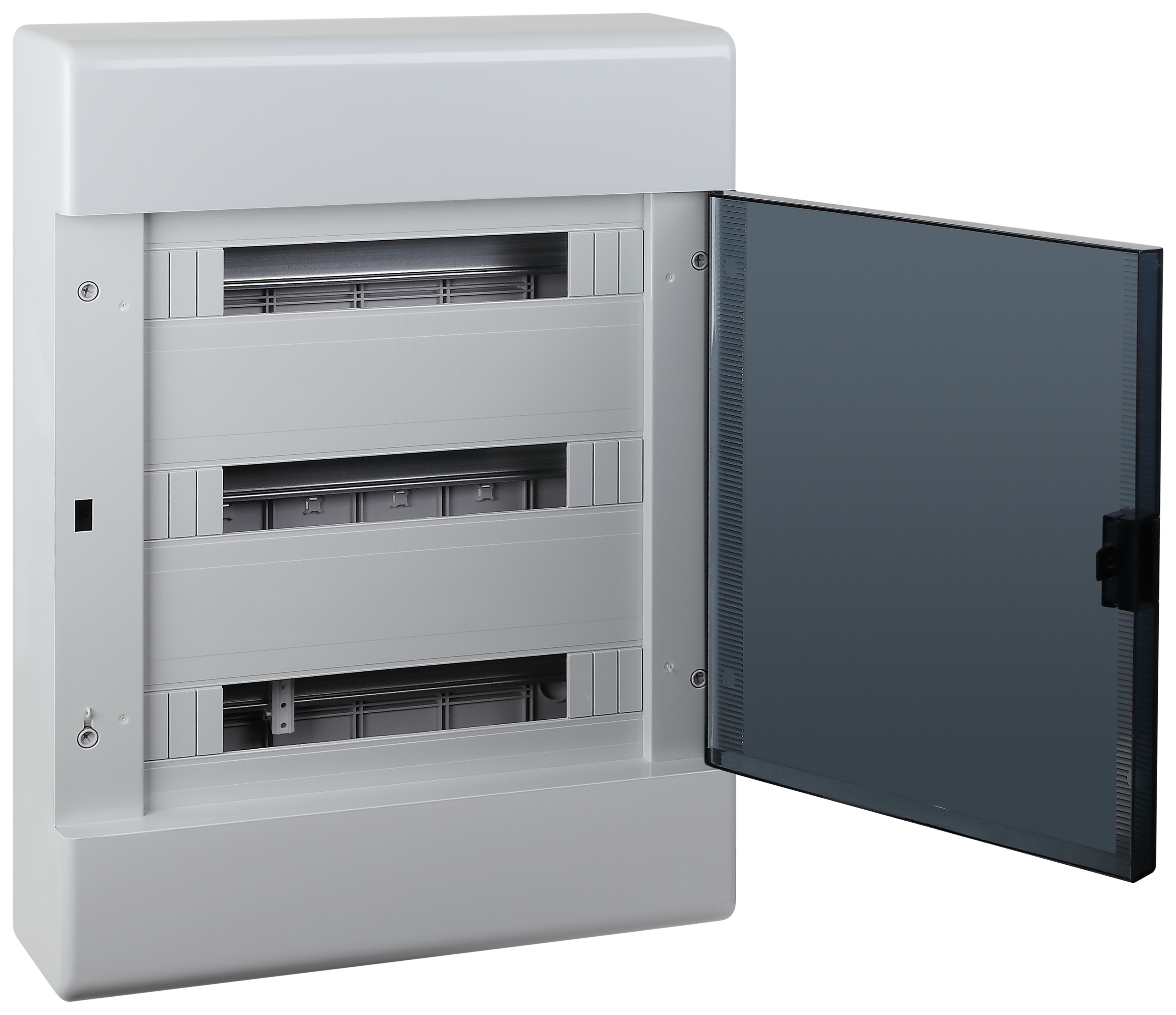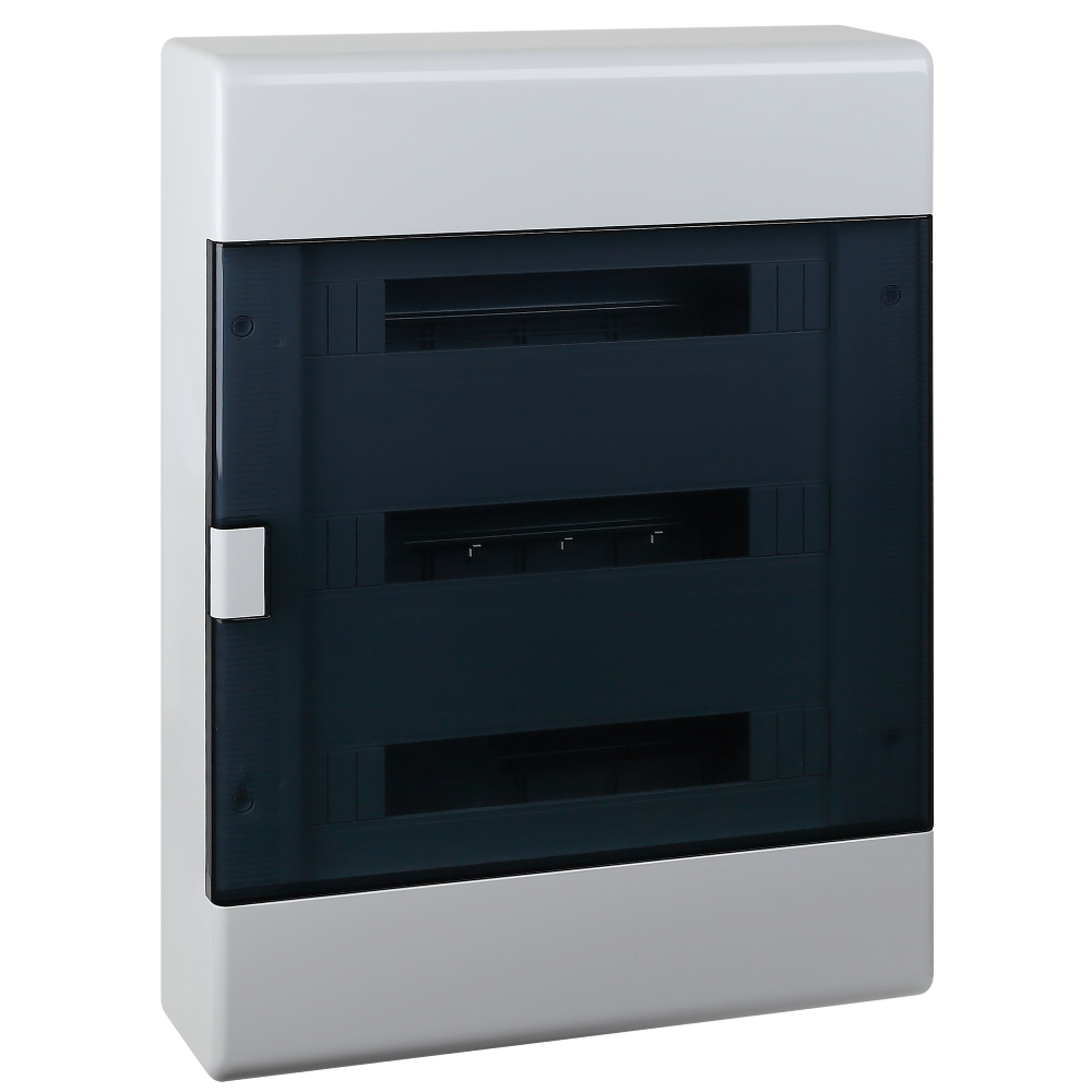 Щиток "Тусо" навесной с горизонтальной дверцей на 54 модуля цвет серый, IP41. Минимальная партия отгрузки 1 шт. Назначение: предназначены для установки автоматических выключателей, устройств защитного отключения и любого нестандартного счетчика или прибора учета в жилых, административных и торговых помещениях. Отличительные особенности: высокое качество пластика; механическая прочность; максимальная комплектация; предусмотрена возможность монтажа пневматическим пистолетом; на основании щитка имеются отверстия для стяжки проводов хомутами; для удобства монтажа рамка с DIN-рейками съемная; перенавешиваемые дверцы; на внутренней части корпуса риски для ввода кабель-каналов любого размера; торцевые стороны щитка снабжены сменными панелями с рисками для подведения гофрированных и гладких труб диаметром 25, 32, 40 мм; регулируемые по глубине стойки крепления DIN-реек дают возможность монтажа модульного оборудования на разную глубину; щитки упакованы в индивидуальную упаковку.