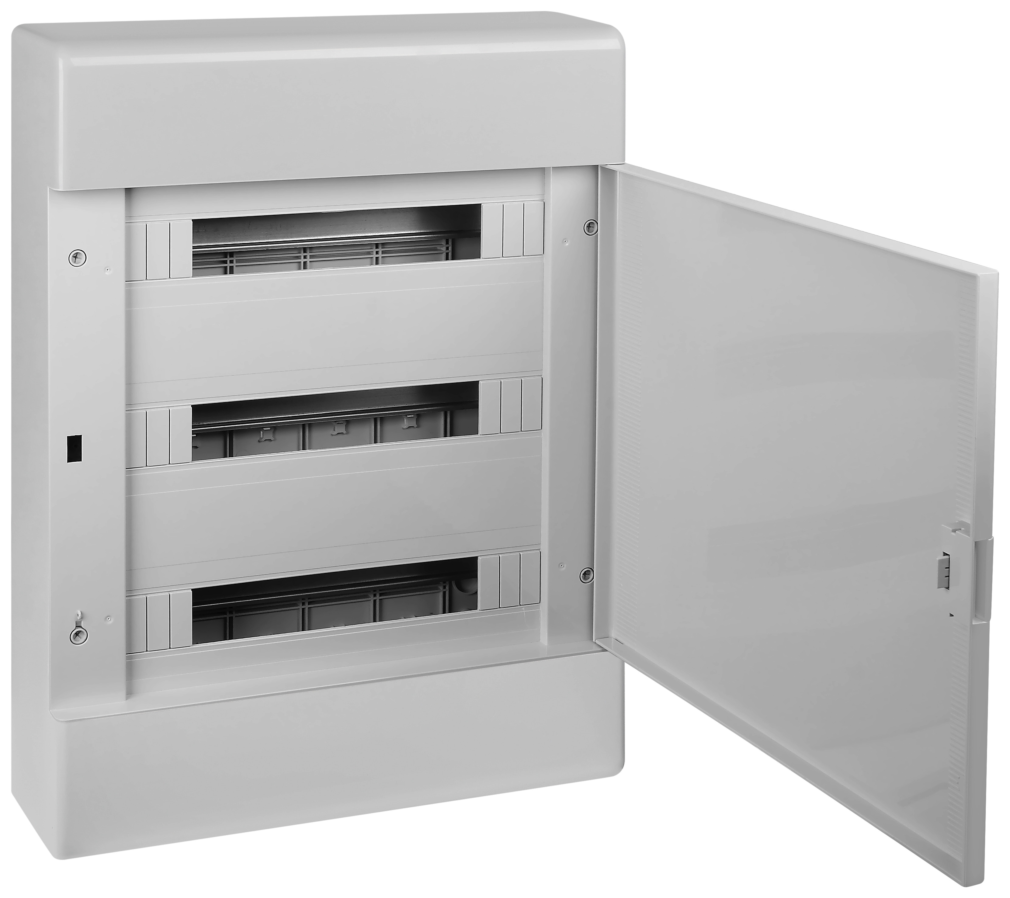 Щиток "Тусо" навесной с горизонтальной непрозрачной дверцей на 54 модуля цвет серый, IP41. Минимальная партия отгрузки 1 шт. Назначение: предназначены для установки автоматических выключателей, устройств защитного отключения и любого нестандартного счетчика или прибора учета в жилых, административных и торговых помещениях. Отличительные особенности: высокое качество пластика; механическая прочность; максимальная комплектация; предусмотрена возможность монтажа пневматическим пистолетом; на основании щитка имеются отверстия для стяжки проводов хомутами; для удобства монтажа рамка с DIN-рейками съемная; перенавешиваемые дверцы; на внутренней части корпуса риски для ввода кабель-каналов любого размера; торцевые стороны щитка снабжены сменными панелями с рисками для подведения гофрированных и гладких труб диаметром 25, 32, 40 мм; регулируемые по глубине стойки крепления DIN-реек дают возможность монтажа модульного оборудования на разную глубину; щитки упакованы в индивидуальную упаковку.