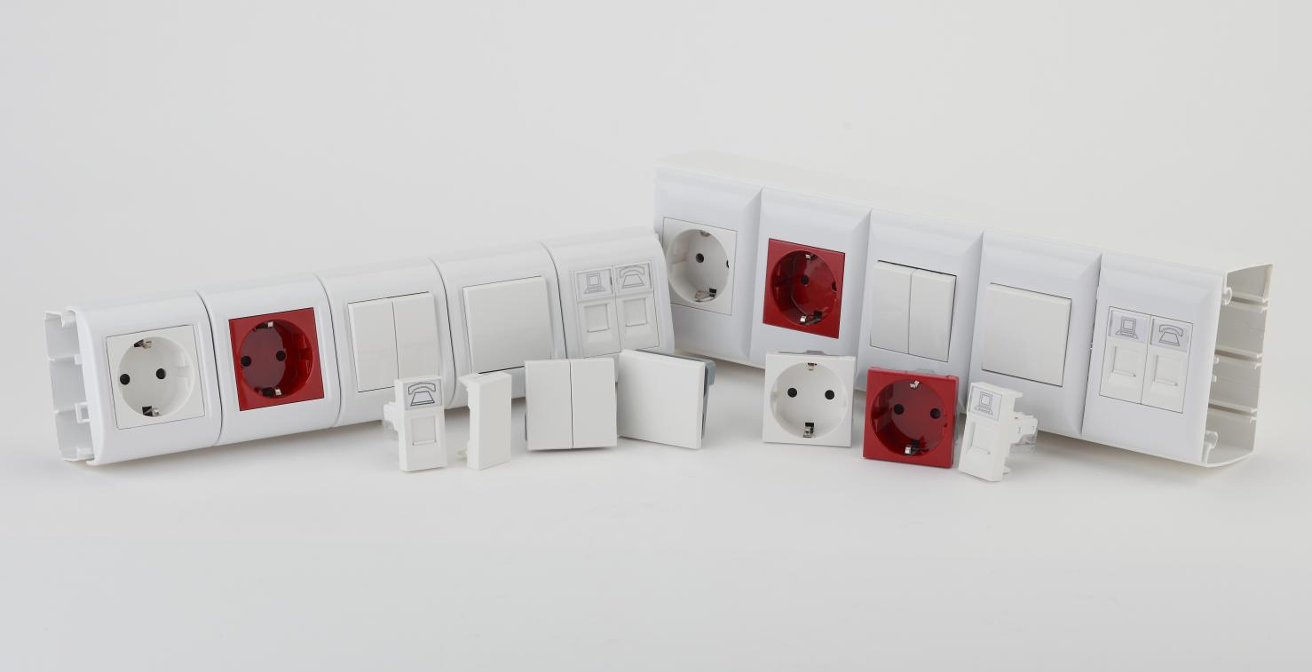 В ассортименте компании «Рувинил» появились изделия как полноразмерные 45х45, так и модульные варианты размеров в половину стандартного поста. Все розетки, выключатели и монтируются в суппорты для кабель-каналов, проложенные открытым способом.