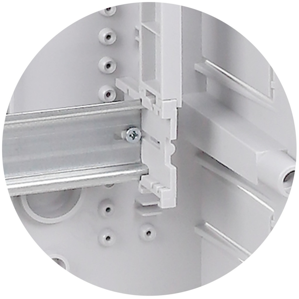 Стойки крепления для DIN-реек дают возможность монтажа модульного оборудования и приборов учёта на разную глубину путём перемещения DIN-рейки в тот или иной паз.